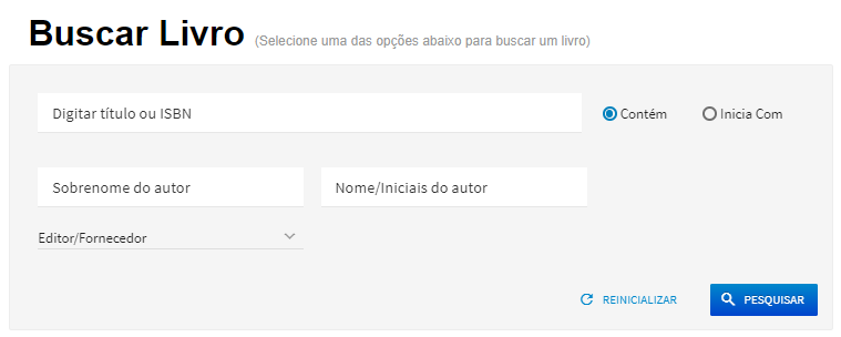 Dessa forma, os usuários encontram um design homogêneo. A partir dele, é possível localizar as obras pelo título ou pelo código ISBN (International Standard Book Number). Também há a possibilidade de buscar títulos inserindo nome (ou iniciais) e sobrenome do autor ou selecionando o editor/fornecedor responsável pela publicação.